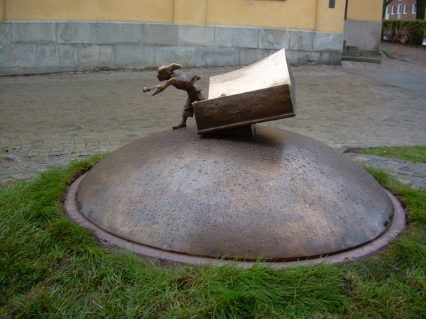 Längs med kupolens nederkant finns ett textband med skulpturens namn och ett kort citat ur boken. "Inte ett ögonblick tvekade han utan rusade fram mot kyrkan"